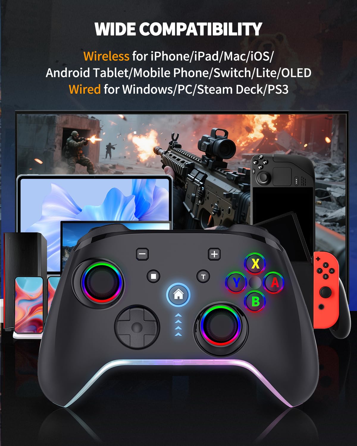 Cool RGB Lighting - The game controller features RGB LED lighting effects, allowing gamers to customise the lighting to their personal preference, creating a more immersive gaming experience. The gaming control is equipped with 8 lights and 1 colorful gradient. It offers 4 lighting modes: colour, wave, breathing, and static. Press the 'RGB' button on the back of the gamepads to switch the light and select from 9 different RGB lighting colors, according to your preference
