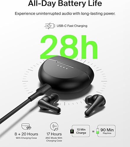 ALL DAY BATTERY + FAST CHARGING: 8 hours of life per earbud plus 20 hours in their case totals a 28-hour battery life, allowing for all day use, from school to the gym and more! Plus, just 10 minutes of USB C fast charging yields 90 minutes of playtime.