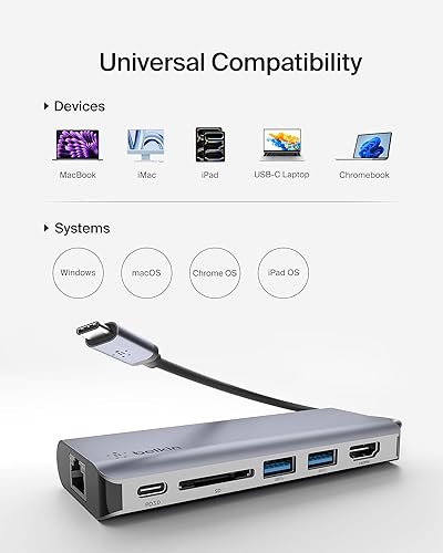 Belkin USB-C Hub - 6-in-1 Multi-Port Adapter Dock with 4K HDMI, USB-C 100W PD Pass-Through Charging, 2X USB-A Ports, Gigabit Ethernet Ports, and SD Slot for MacBook Pro, Air, iPad, Pro, XPS and More(6-in-1 Hub- 4K 30Hz)