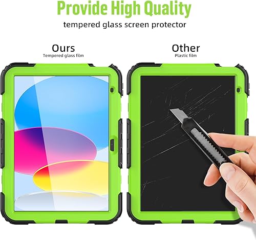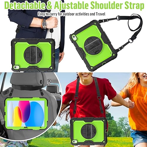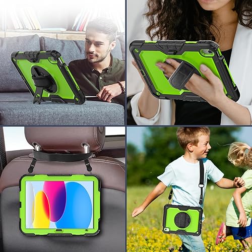 BLOSOMEET Case for iPad A16 11th/10th Generation 11''/10.9'' 2025 2022 with Tempered Glass Screen Protector, Rugged Cute Girls Boys Cover with Stand Hand Shoulder Strap, Fashion Yellow(Green,Case for iPad 10th Gen 10.9")