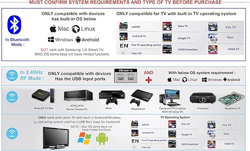 Compatible - MUST SEE COMPATIBLE MODEL LIST IN DESCRIPTION before purchase - whether your device has bluetooth enable ready or if not but has an input usb port for keyboard, our dual mode function transmission wireless keyboard can work with your device, compatible devices such as Android TV Box, Smart TV, Raspberry pi, Xbox 360, PS3, HTPC, Home theater PC, IPTV, iPad, PC, Desktop, Projector, etc. ** Also compatible for Amazon Fire TV Stick 4K/ Lite/Cube in bluetooth mode, need separated OTG adapter in 2.4Ghz mode, see description **