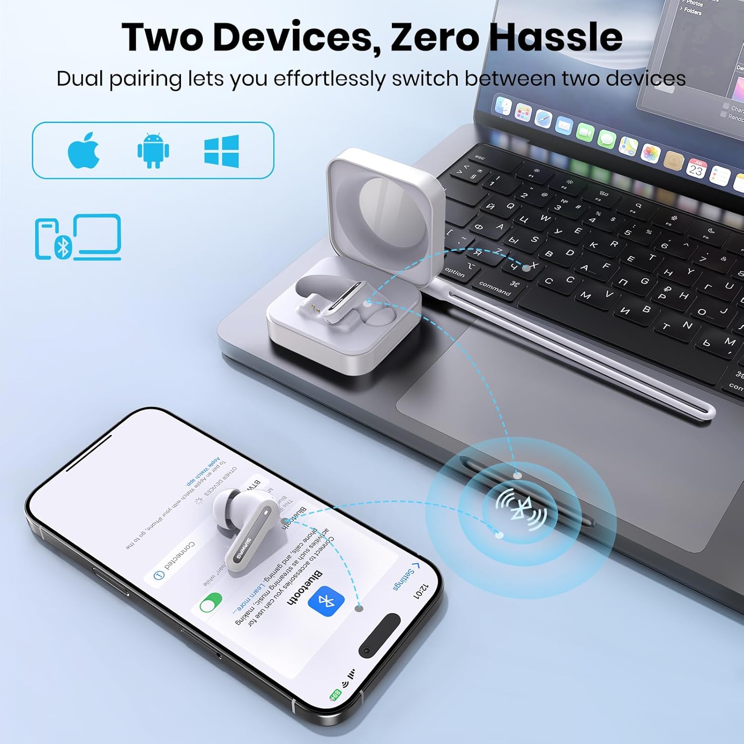 Ultra Lightweight: The surface and Angle of earbuds in-ear part have been polished and refined repeatedly to achieve a balance between beauty and comfort and make it comfortable to wear. The compact charging case fits easily in your pocket or bag, likewise, a single earbud weighs only 4g. The elastic silicone strap that comes with Bluetooth earphones makes carrying more convenient.
