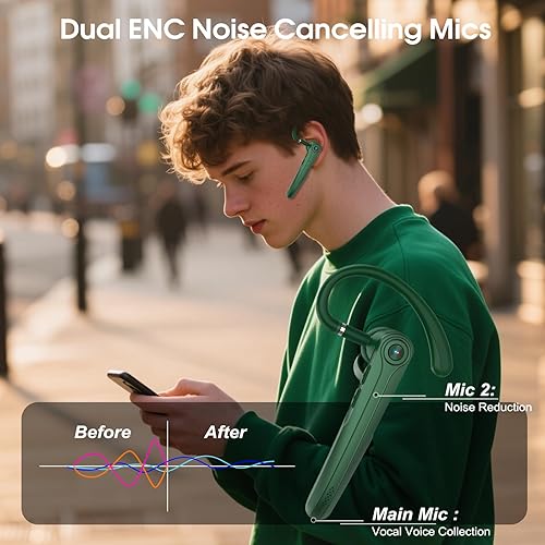 Bluetooth Headset, Wireless Bluetooth Earpiece with ENC Noise Canceling Mic, 120Hrs Talk Single-Ear Headphones, LED Display, IPX7, V5.4 Hand-Free Earphone for Business/Trucker/Driver, Green(Green)