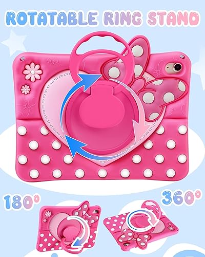 Boaretiu Kids Case for iPad 5th/6th Generation/Air1/Air2/Pro 9.7 inch - Cute Girly Cartoon Soft 3D Bow Heart Dot Silicone Case with Strap & Rotating Stand Tablet Cover for Girls Teens(for iPad 10th/for iPad A16 11th Gen)