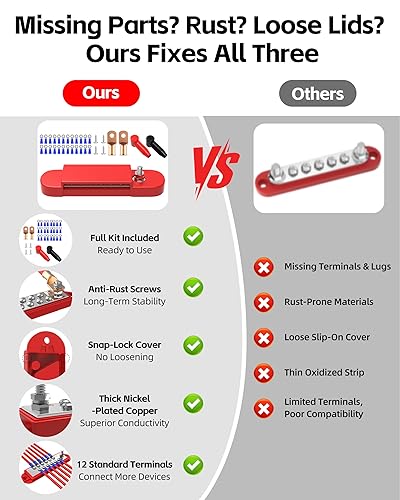 Smart Locking Cover for Secure Installation: This 12 volt busbar kit features a bolt-through bottom-to-top screw structure for added mechanical strength and durability. The smart inverted-buckle design securely locks the silicone protective cover, preventing it from falling off during motion or vibration in RVs, trailers, or boats. With clear polarity for positive and negative bus bars, Crivon terminal block allows quick plug-and-play installation, ensuring safe DC cable and wire distribution