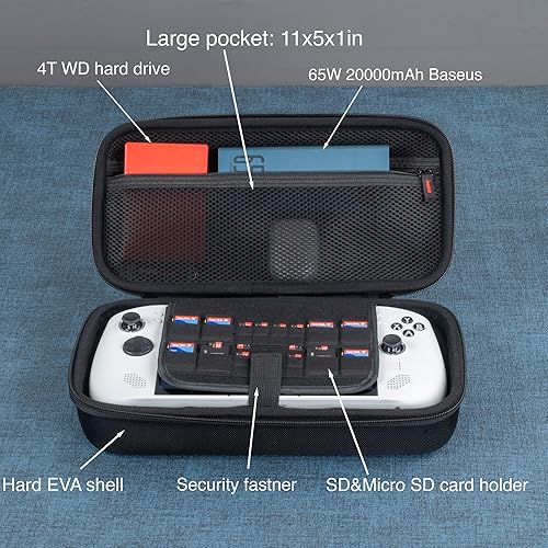 Sturdy hard carrying case bag specifically designed for Lenovo Legion Go S handheld with secure storage for charger, cables, external hard drive, large power bank, multiple MicroSD and SD cards.