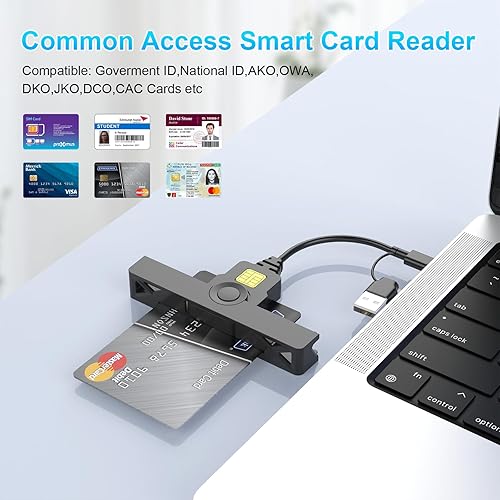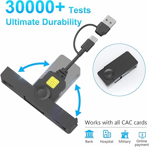 【Certifications Standards】Type C/USB military cac card reader support ISO7816 Class A, B and C (5V/3V/1.8V) Smart Cards; CAC military reader compatible with US Military and Government DOD ID cards for secure login and RECOMMENDED by militarycac.com Movement detection with auto power-off Automatic Detection of smart card type Short circuit and thermal protection