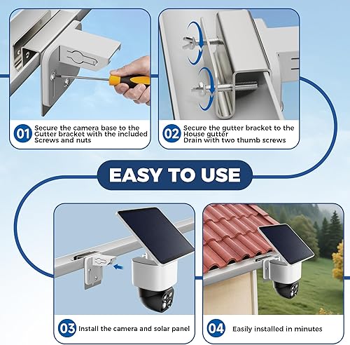 Tool-free Quick Installation: No drilling or professional tools are required, and the installation can be completed in 3 minutes. Simply mount the camera on the no drill security camera mount and use the provided butterfly rust-proof screws to fix the outdoor security camera accessories to the gutter.Unique buckle design does not damage the sink,comes with a graphic manual