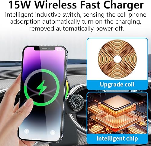 【Support 15W Fast Charging】Featuring advanced in-car wireless charging technology with an oversized coil, this charger maximizes power output and charging efficiency, intelligent temperature control core and cooling metal plate, ensure efficient heat dissipation. The built-in smart chip provides over-current, over-voltage and over-heat protection to ensure safe charging and protect the mobile phone battery from damage.