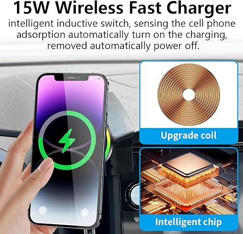 【Support 15W Fast Charging】Featuring advanced in-car wireless charging technology with an oversized coil, this charger maximizes power output and charging efficiency, intelligent temperature control core and cooling metal plate, ensure efficient heat dissipation. The built-in smart chip provides over-current, over-voltage and over-heat protection to ensure safe charging and protect the mobile phone battery from damage.