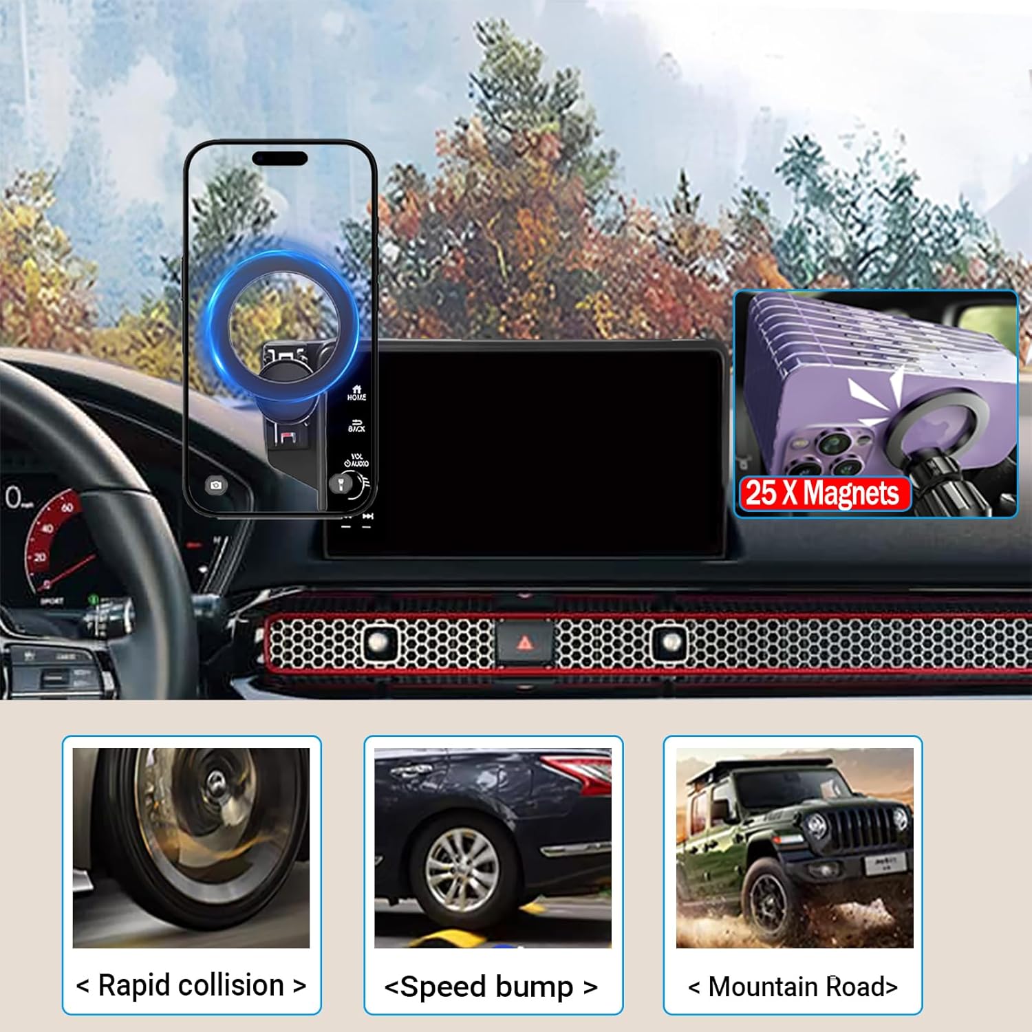 【Ultra Strong for MagSafe Magnetic Hold】:Car Phone Holder comes with 25 wider N55 magnets that provide super-strong suction. Non for MagSafe phones? Use the included metal ring for a secure, wobble-free grip—even on bumpy roads