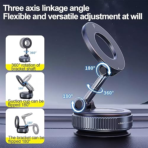 Mount Up in 3 Seconds: Secure your magnetic phone holder for car in just 3 seconds. Tear off the dust film and press the suction cup to remove air, then rotate clockwise to lock the suction cup and generate strong vacuum suction. No tools, no trouble - adjust the appropriate angle to place the phone, and no matter where you install it, you can firmly and stably hold it.