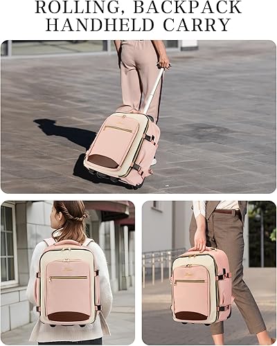 Carry On Backpack with Wheels for Adults, Airline Approved Rolling Backpack for Women, Foldable Bottom Travel Laptop Backpack (Deep Green)(Pink)