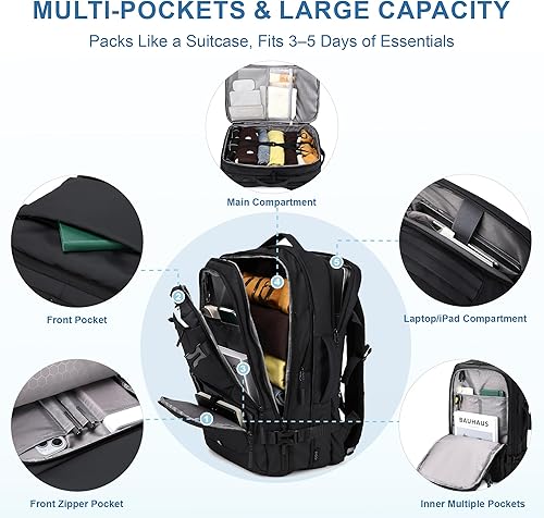 Large Capacity & Expandable Space: This travel backpack is designed for 3–5 day trips, offering multiple functional pockets and the equivalent storage of a 35L carry on luggage. Open the expansion zipper to add 2 inches of depth for extra space. This travel backpack for women and men includes a padded 15.6" laptop sleeve, waterproof wet pocket, hidden anti-theft pocket, interior compartments, and side pockets for organized storage.