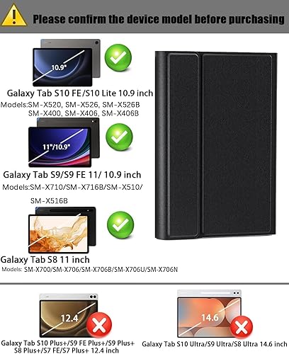⌨【Model Compatibility】Designed ONLY for Samsung Galaxy Tab S10 Lite / S10 FE / S8 / S9 / S9 FE 10. 9-11 inch :Tab S10 Lite(SM-X400, SM-X406, SM-X406B) Tab S10FE(Model: SM-X520, SM-X526, SM-X526B) Tab S8 (Model: SM-X700 /X706 /X706B /X706U /X706N) Tab S9 (Model: SM-X710 /X716B) Tab S9 FE (10.9 inch) (Model: SM-X510 /X516B) Not compatible with other models. You can check the model number before purchasing to make sure you get the correct size tablet keyboard case.