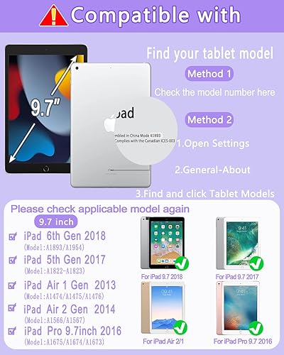 【Compatible Models】This keyboard cover is compatible with iPad 6th 5th generation(models:A1822/A1823/A1893/A1954). iPad Air 1&2(models:A1474/A1475/A1476/A1566/A1567).iPad Pro 9.7(models:A1673/A1674/A1675).Before purchasing, please check the model number of "AXXXX" on the back of iPad. "Axxx". (This product does not include: tablet, pencil)