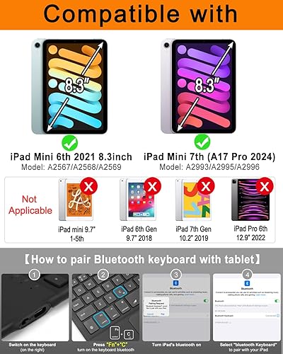 【Compatible Models】This keyboard case is designed only for iPad mini 7 2024 (A2993/A2995/A2996) / iPad mini 6 2021 (A2567/A2568/A2569). Not suitable for other iPad tablet devices. Please check the model number of "AXXXX" on the back of your iPad before purchasing. (This product does not include: tablet, pencil!)