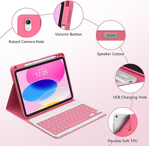 CC Store for iPad A16 11th 10th Generation Case with Keyboard - Detachable Folio Keyboard Cover with Pencil Holder for iPad 11-inch A16 2025 10th Gen 10.9 Inch 2022(Pink)(Red)