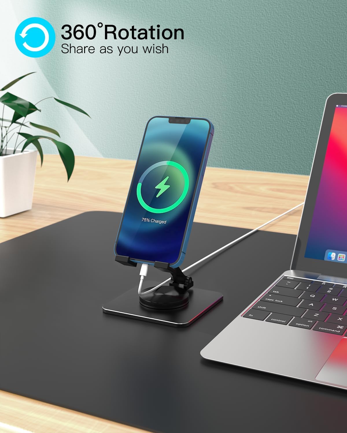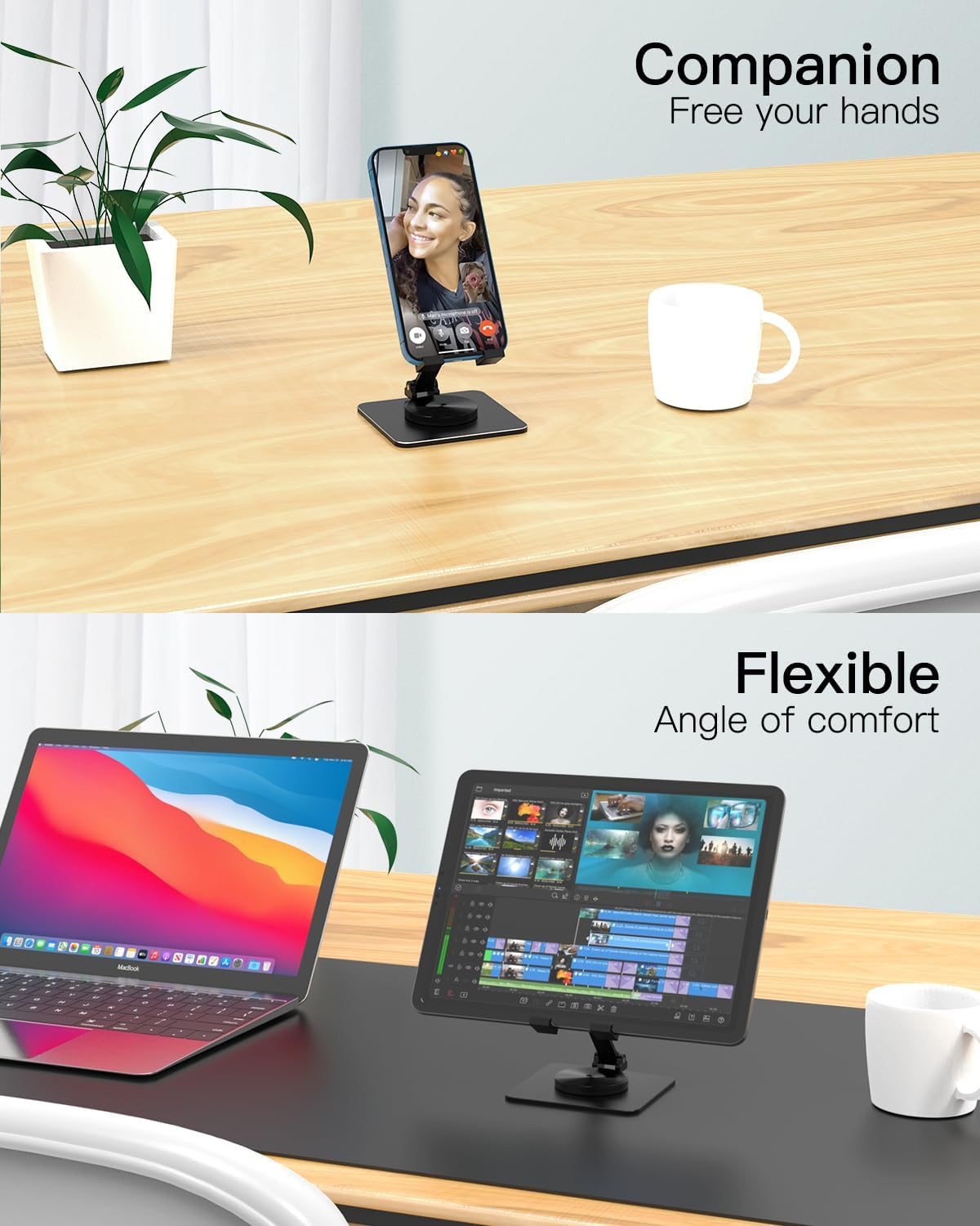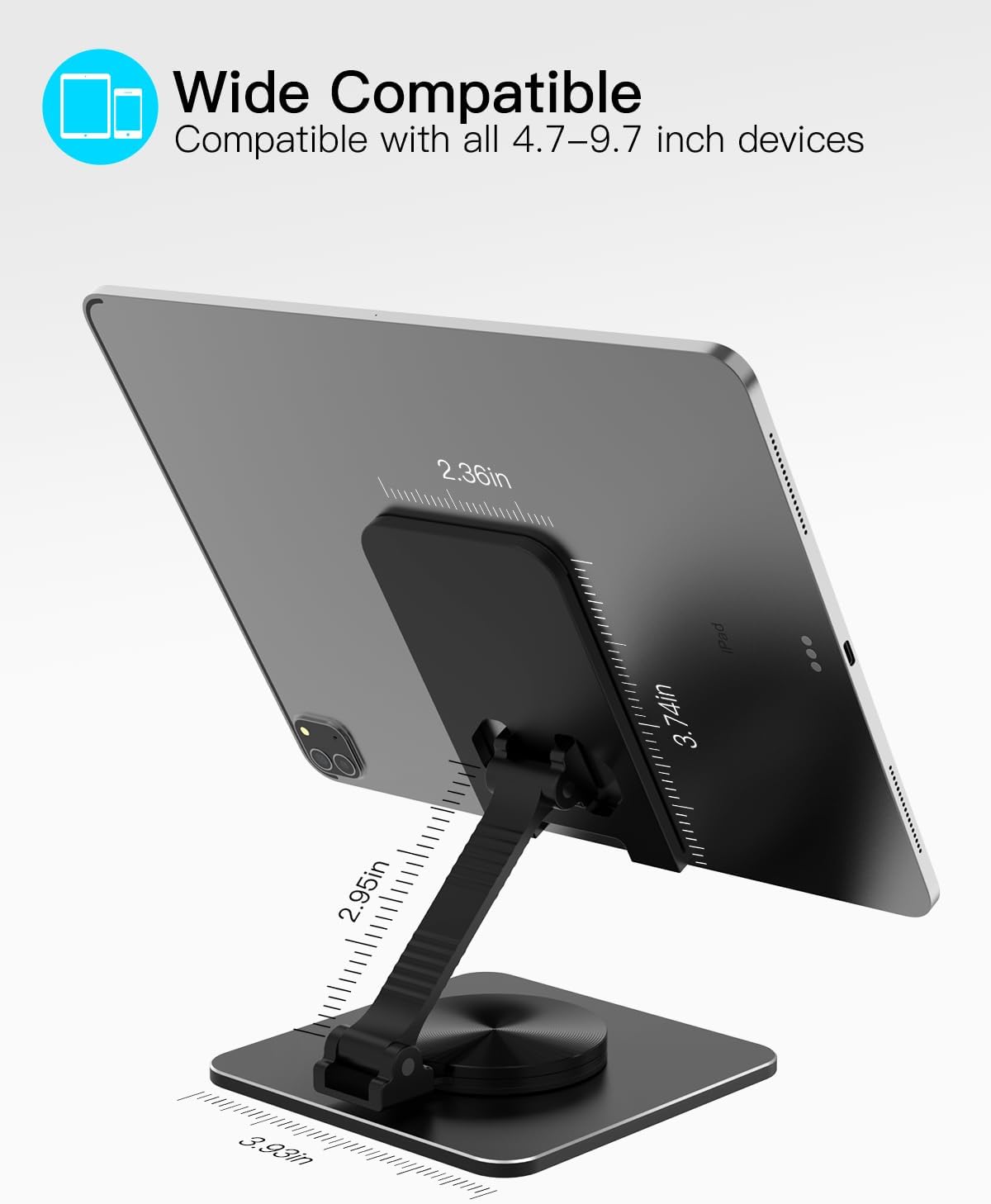 Cell Phone & Tablet Stand for Desk, Aluminum Adjustable Holder for iPhone, iPad & Smartphones || Foldable Mount with 360° Swivel, Stable Base & Portable Design for 4–9.7in Devices, Black(Black)