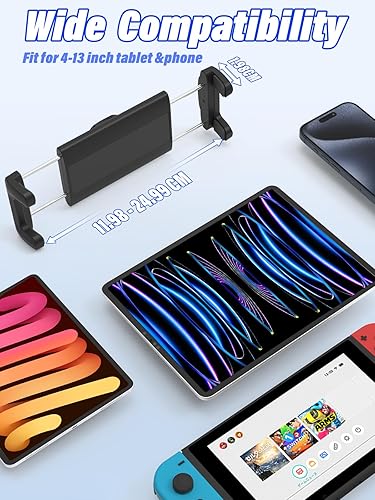 【Wide Compatibility】Universal tablet mount adjustable clip fits all 4.7-13'' devices. The clip size 4.7-9.64'' (11.93-24.5cm), Thickness 0.7'' (1.8cm), which makes the clip work with or without a case Can hold on tightly. Compatible with tablets such as ipad 11/air/12.9''/13" series; ipad mini 4/5/6; Galaxy Tab; Compatible with 99.9% of mobile phones on the market at the same time, Such as iPhone15 Pro Max/14/13/12/11 series; Galaxy Z Fold/Flip. GPS Navigator, etc.