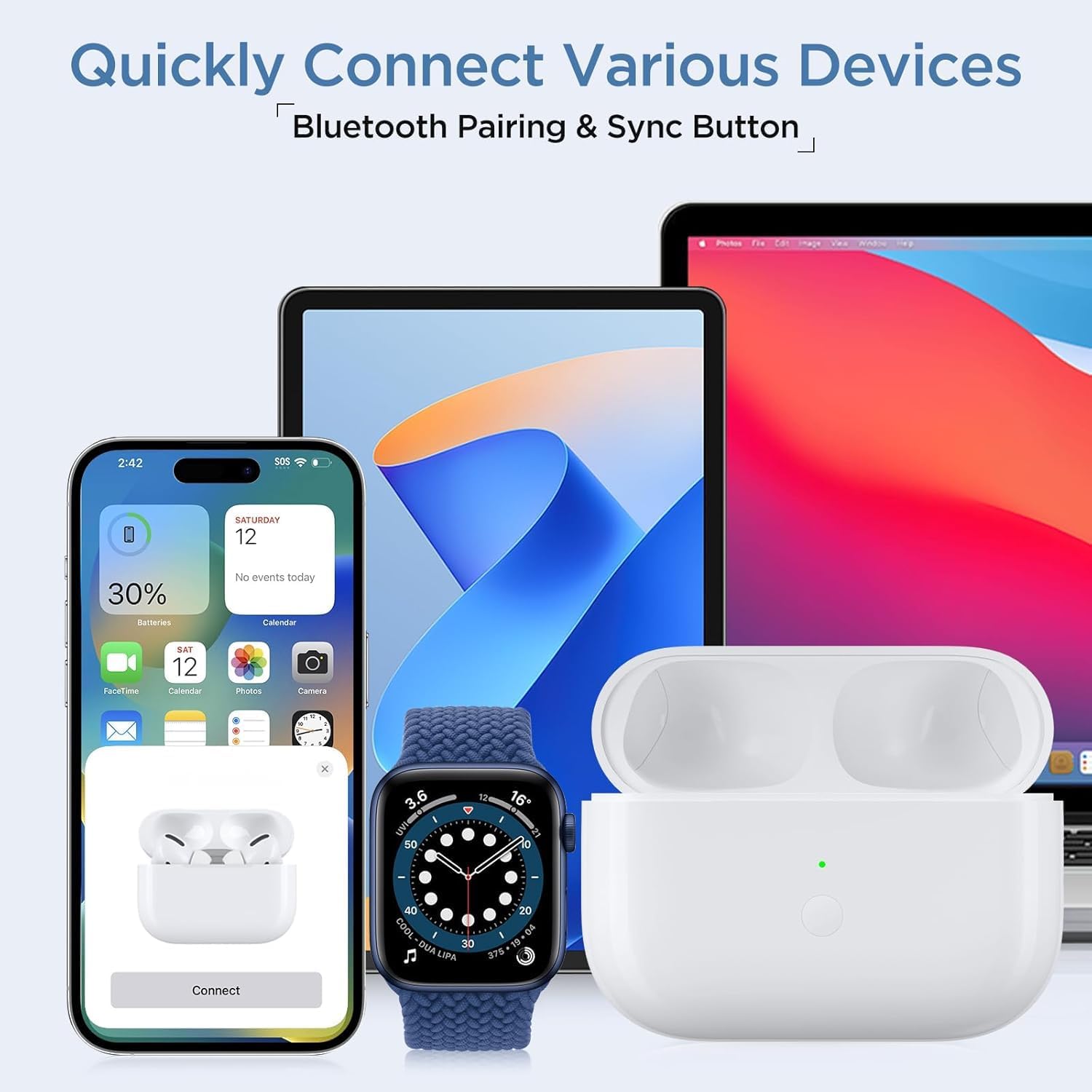 【Convenient Connections】Our airpods pro charging case features high-quality chips and a dedicated sync button for quick Bluetooth pairing. Your devices will reconnect automatically upon subsequent use. Note: To disable the tone, press and hold the pairing button for 5 seconds with the lid closed