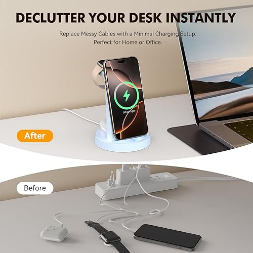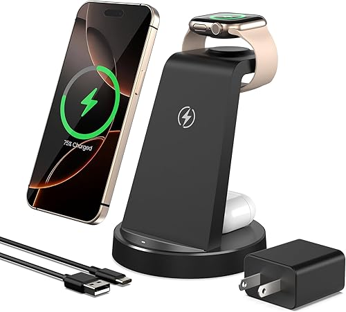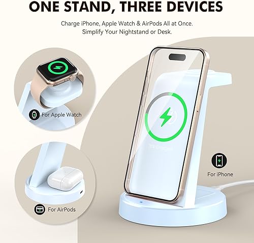Fast Wireless Charging Station with Smart Output: Delivers 7.5W for iPhone 17 16e 16 15 14 13 12 X 8 Series, 2.5W for Apple Watch (Series 11 10 9 8 7 6 5 4 3 2 Ultra Se), and 3W for AirPods 4 3 2 Pro 3 /2 /1. Intelligent chip ensures temperature control, voltage protection, and stable fast wireless charging.