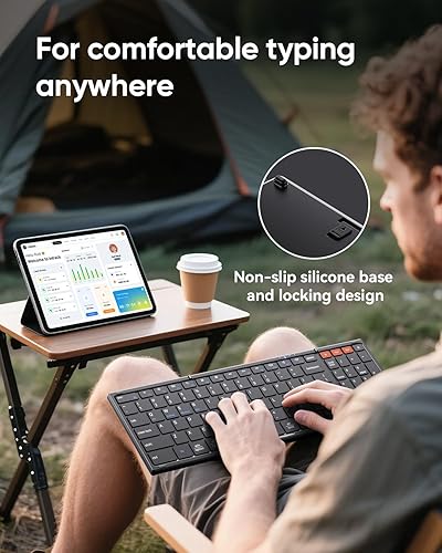 【True Lap-Friendly Design】: Unique non-slip silicone base and locking design keeps keyboard stable on airplanes, trains, couches, or legs - unlike others requiring flat surfaces.
