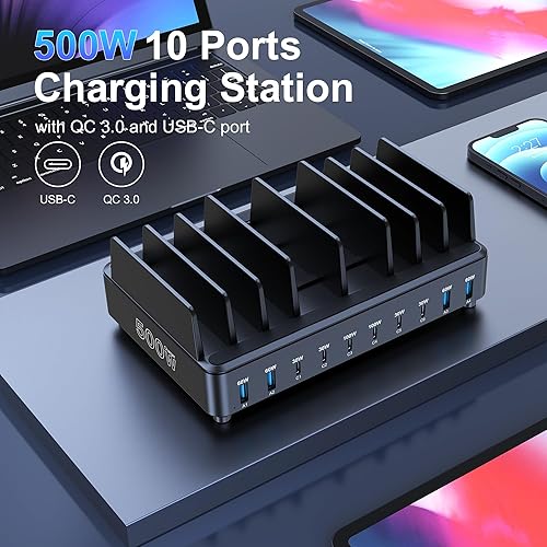 500W High Power & 10-Port Efficiency: This multi device charging station can significantly meet your daily charging needs. Delivers up to 500W total power with 10 charging ports (C3/C4:100W, C1/C2/C5/C6:30W, A1-A4:60W), fast charging laptops, tablets, phones, and more simultaneously for maximum efficiency