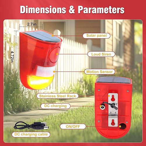 IP65 Waterproof and Durable:Constructed from high-quality ABS plastic with an IP65 waterproof rating,this solar alarm motion detector with sound withstands rain, snow, and other outdoor conditions, providing long-lasting garden protection.Low maintenance