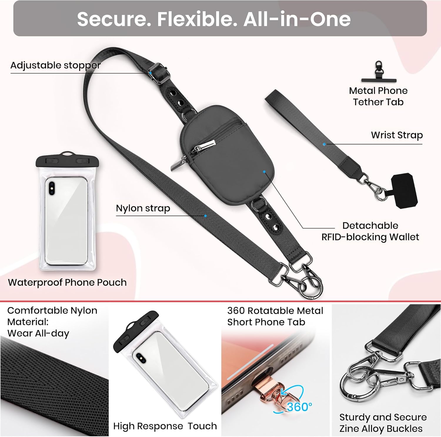 Clip and Go Strap for Phone with Wallet Crossbody – Cellphone Strap With RFID Blocking Wallet and Waterproof Phone Case – Adjustable Cellphone Lanyard for Women