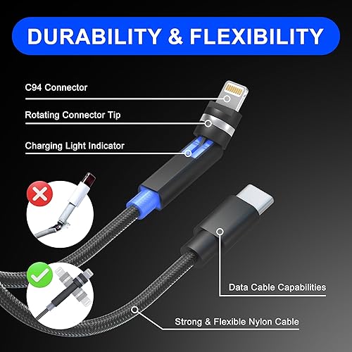 【Fast charging & Data Sync】Our USB C to lightning cable supports up to 27W/3A safe and fast charging. High speed data transfer up to 480 Mbp/s for transfer photos, music, videos, files. It efficiently charges your iOS devices.Charging Speeds Faster than USB A Cable. This swivel USB-C iPhone cable supports Apple CarPlay for seamless in-car entertainment system connection while driving.