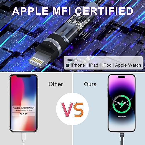 【MFi Certified Safety and Compatibility】Apple certified chip ensures 100% compatibility with i Phone devices. No pop ups, improved charging efficiency and safe charging cable performance every time. Fully compatible with iPhone 14/14 Pro/14 Pro Max/14 Plus/13/13 Pro/13 Pro Max/12/12 Pro/12 Pro Max/11/11 Pro/11 Pro Max/XS Max/XS/XR/X/8 Plus/8, iPad Pro 12.9 gen1/iPad Pro 10.5"/iPad Air3 10.5"/iPad mini5 7.9 iPhone 7 Plus/7/6S Plus/6S/6 Plus/6.