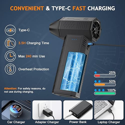 Fast Charging: This air dust supports Type-C charging and can be fully charged in 3.5 hours. The high-performance battery allows the product to last longer, with up to 240 minutes of use on the lowest setting. For a better user experience, it is recommended to fully charge before use. Tips: For safety reasons, do not use the device while charging.