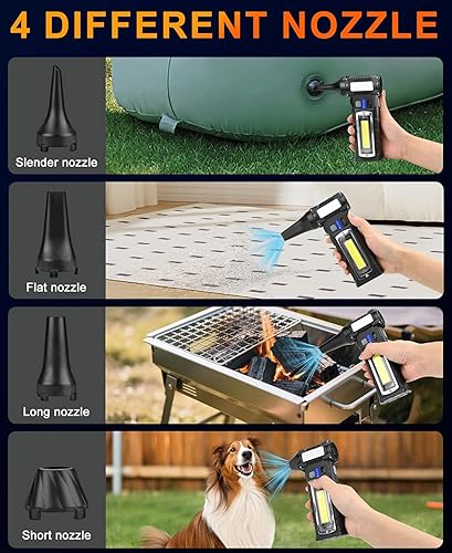 VERSATILE USE: The Minsk compressed air duster offers 4 interchangeable nozzles in different sizes, making it suitable for a wide range of cleaning tasks. It can be used to clean keyboards, air conditioner vents, car interiors, electronics, and other delicate items. Beyond dust removal, it also supports inflating objects and can even serve as a mini cooling fan when needed.