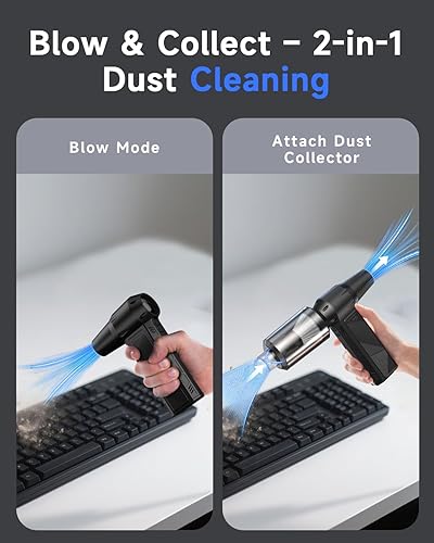 【Versatile Multi-Use Applications】More than just a compressed air duster, this 2-in-1 blow & suction cleaner comes with 2 nozzles, a brush, and a built-in dust box. Easily switch between powerful air blowing to remove dust and strong suction to pick up debris and pet hair. Ideal for electronics, car interiors, furniture gaps, and inflatables, it makes cleaning quick and efficient. Unlike standard blow-only devices, it offers suction collection for a deeper, more thorough clean.