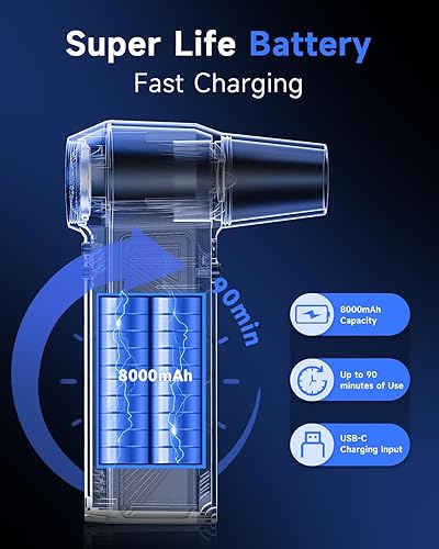 【Fast Charging & Long-Lasting Power】Built with a 8000mAh rechargeable battery, this air blower gun delivers up to 90 minutes of continuous use. The Type-C fast charging port powers up the unit in just 3 hours, ensuring strong airflow anytime without interruptions.