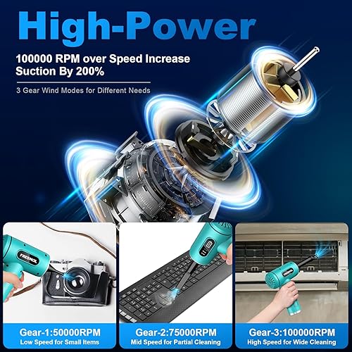 Powerful Performance:The air duster has a maximum speed of 100000 RPM motor with 3 gear adjustable airflow settings, providing 1.86-2.51 oz of blowing power. Allows you to customize the airflow for different cleaning needs. Provides efficient cleaning.