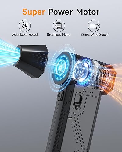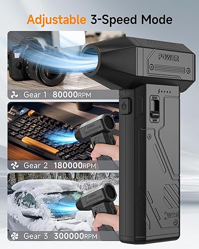 【Super Power Brushless Motor 】 W20 compressed air duster reaches speeds of up to 300,000 RPM, delivering a maximum wind speed of 52m/s. This allows it to effectively clear dust and debris. The electric air duster also features 3-speed adjustable speed mode and stepless speed adjustment mode to cater to various cleaning needs.