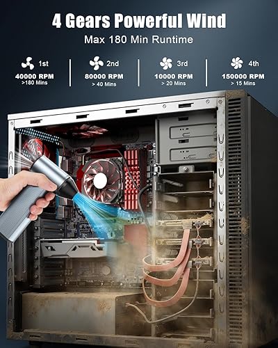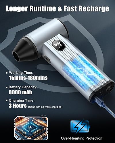 UPGRADED BATTERY LIFE: This air duster features an 8000mAh battery, a 33% increase in capacity(compared to 6000mAh model). It provides up to 180 minutes of runtime on the first gear, and up to 15 minutes in max gear, ensuring it can handle all your needs.