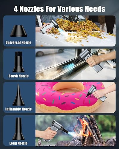 ECONMICAL AND VERSATILE TOOL: The Air blower is a sustainable alternative to disposable air cans. Come with 4 nozzles and 4 brushes, it can handle diverse cleaning tasks such as blowing leaves and snow, inflating gear, cleaning car interiors, keyboard crevices, and computer components.