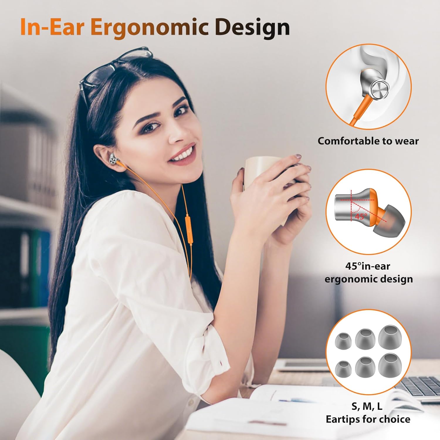 Durability TPE Cord & 45° Ergonomic Design: Our Type C Wired Earbuds adopt updated TPE covering and enhanced joint, survive 10,000+ bend tests, 120cm/3.9ft long wired cord earphones good for daily use; 45° In-ear Ergonomic design perfectly with ear anatomy, coupled with 3 sizes of silicone ear tips for all-day comfort that stays secure during running or gym sessions