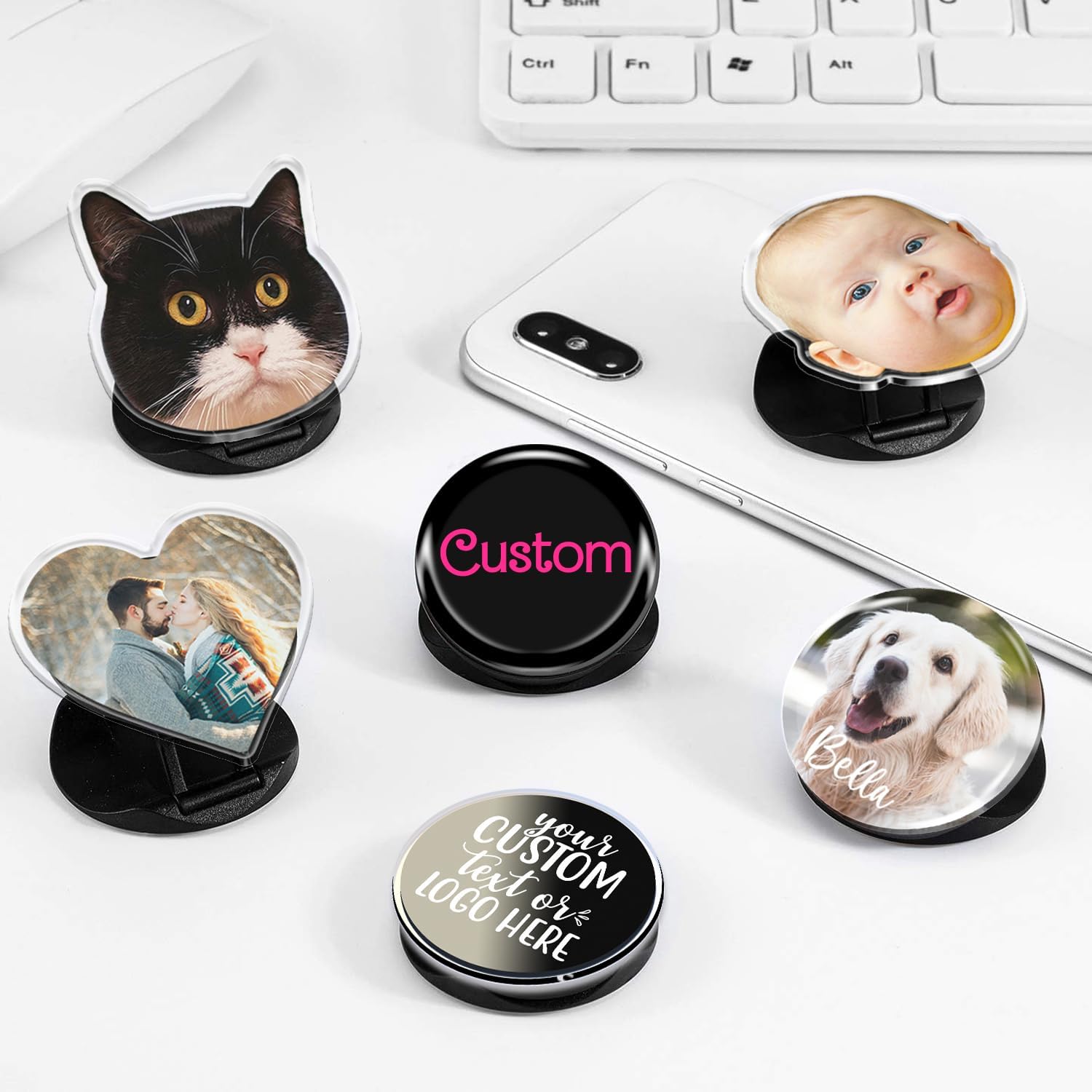 Custom Phone Grip Personalized Human and Pet Face Acrylic Photo Foldable Black Phone Holder Adhesive Socket for Kindle & All Phone Models Gift for Women Men