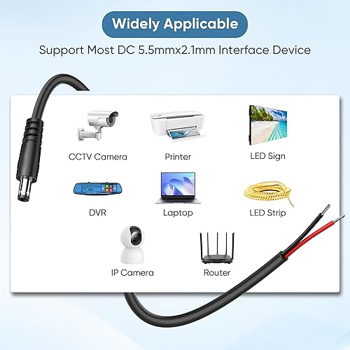 【Versatile Compatibility】DC power pigtail cable wire used for Ip camera, DVR Standalone, Audio camera Ideal for LED light strip, LED signage, and CCTV security camera, car, boat, monitors, lighting,printers, sensors, DVR, external hard drives,audio mixing and recording equipment.