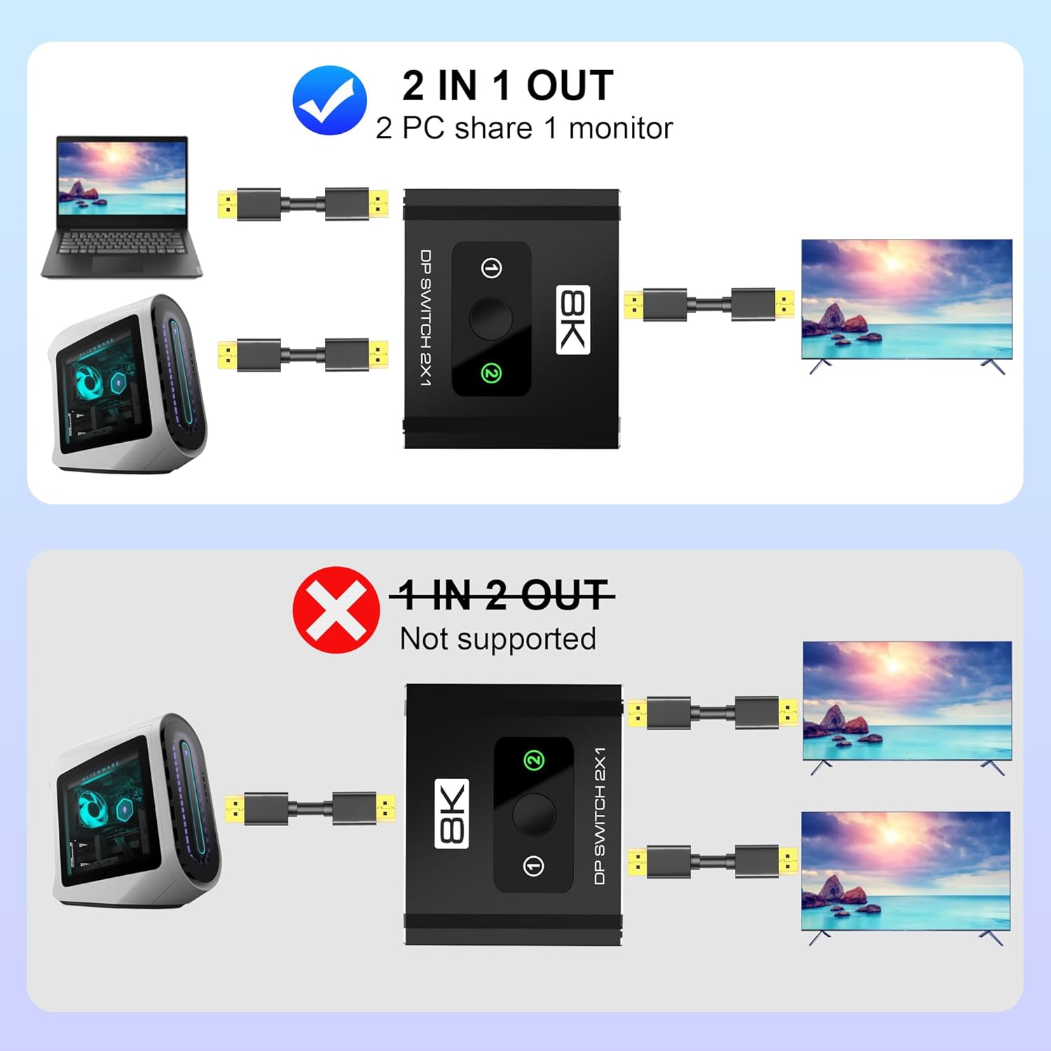 【High Compatibility & Reliable Performance】Equipped with an advanced chipset and high-quality materials, this DisplayPort switch is compatible with TVs, monitors, projectors, PCs, and laptops.(Note: Some hubs or DP adapters may cause compatibility issues — we recommend connecting directly when possible.)