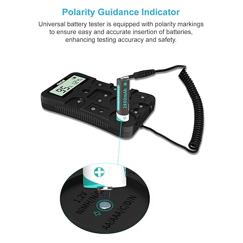 【B4】ROBUST COMPATIBILITY: Universal battery tester is compatible with 12 battery types, including 1.2V Ni-MH/1.45V Zinc Air/1.5V Alkaline/3.0V Lithium Manganese/3.2V LiFePO4/3.7V Li-ion/6.0V, 9.0V, and 12.0V Alkaline packs ect; It supports AAA AA C SC D N sizes, button cells, CR123A, CR-V3, 2CR5, 23A, 27A, and more, offering versatile compatibility for various applications