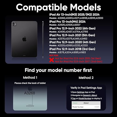 Adaptation Model- Only compatible with New iPad Air 13-inch (M3, 2025), iPad Air 13-inch(M2, 2024), iPad Pro 13-inch (M4, 2024), iPad Pro 12.9 (3/4/5/6th Gen).models:A2925,A2926,A3007,A2898, A2899, A2900, A2436, A2437, A2764, A2766, A2378, A2379, A2461,A2462, A2229, A2069, A2232, A2233, A1876, A2014, A1895, A1983,Please confirm your iPad model before purchasing