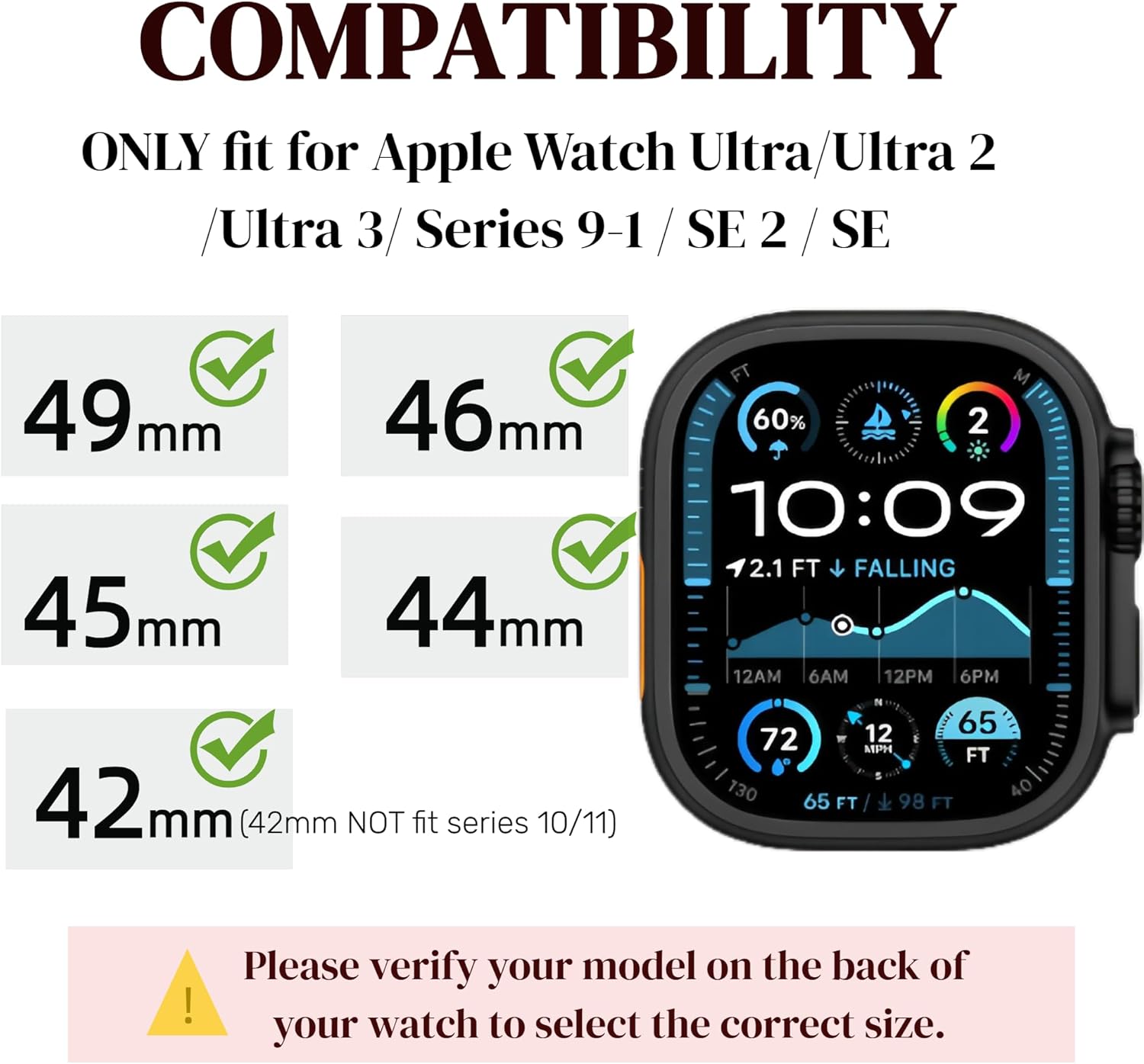 【Compatible Models】Designed for Apple Watch Ultra/Ultra 2/Ultra 3 (49mm), Series 10/11 (46mm), Series 9/8/7 (45mm), SE 2/SE(44mm), Series 6/5/4 (44mm), and Series 3/2/1 (42mm)Note: Please verify your model on the back of your device to select the correct size for Apple Watch band.