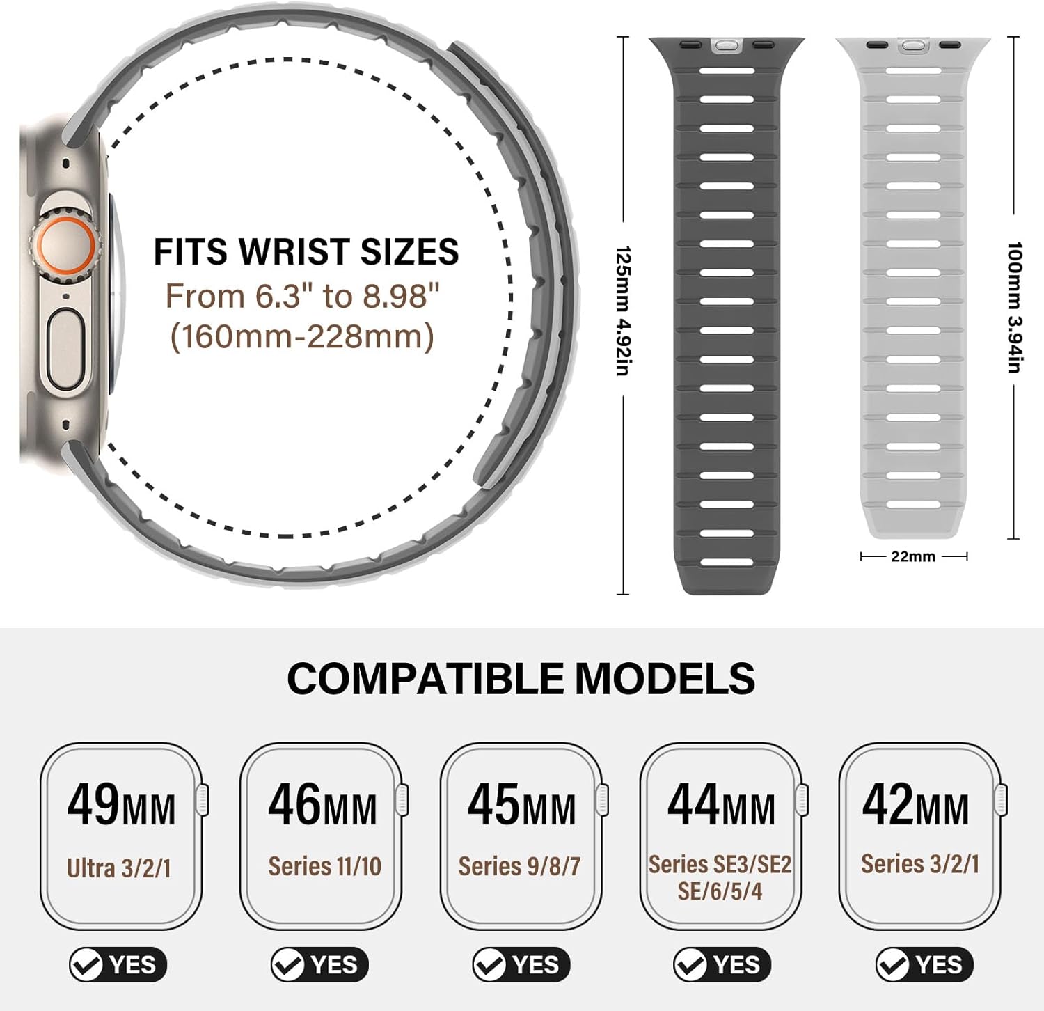 Compatible Models: Dolstrap double sided wearable silicone magnetic band is compatible with Apple Watch Ultra 3/2/1(49mm)/ SE 3/2/1(44mm) / Series 11/10(46mm)/ Series 9/8/7(45mm)/ Series 6/5/4(44mm)/ Series 3/2/1(42mm) and fit wrists size 6.3"-8.98" (160–228mm). (Note: No Watch Included)
