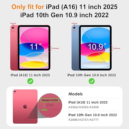 Compatibility: Only compatible with iPad (A16) 11th generation 11-inch 2025 (model: A3354, A3355, A3356), iPad 10th generation 10.9-inch 2022 (model: A2696, A2757); Not compatible with other iPad models; Please check the back bottom of your iPad for the model number "AXXXX" to confirm compatibility