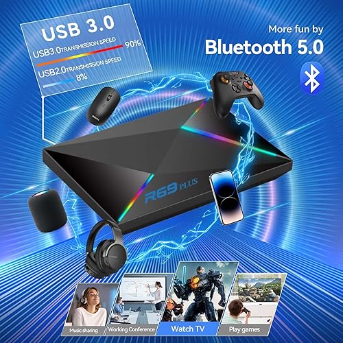 【Customized Home Screen & Voice Control】This smart TV box support personalized customizable home screen. You can add channel content that you want to see on the home screen. Remote control voice assistant can easily fulfill your voice commands. The neon light that lights up when you turn it on turns your living room into a tech-filled entertainment space for the best home theater entertainment.
